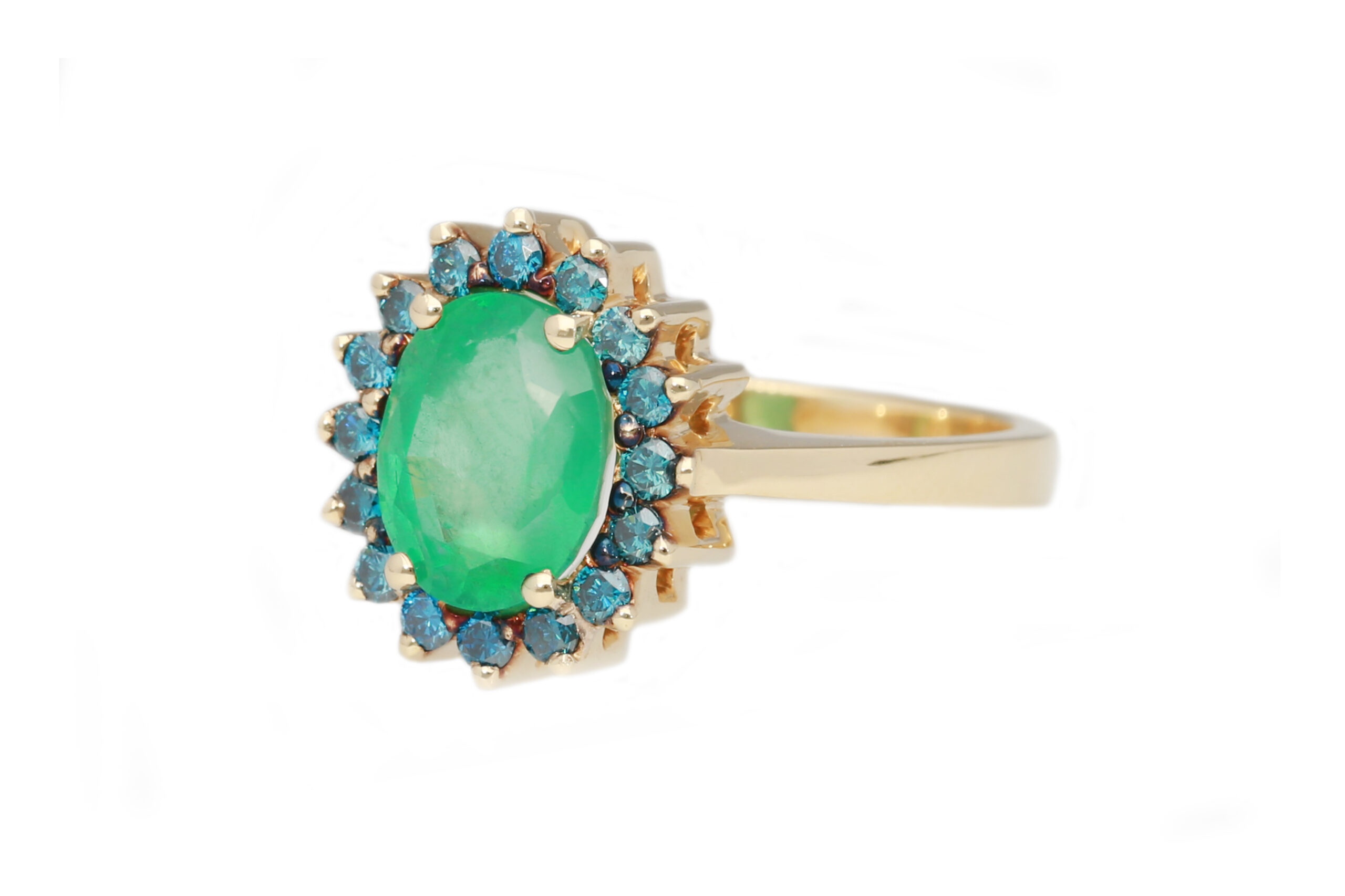18k yellow gold ring with 0.50 ct azure diamonds and a 3.05 ct center emerald.