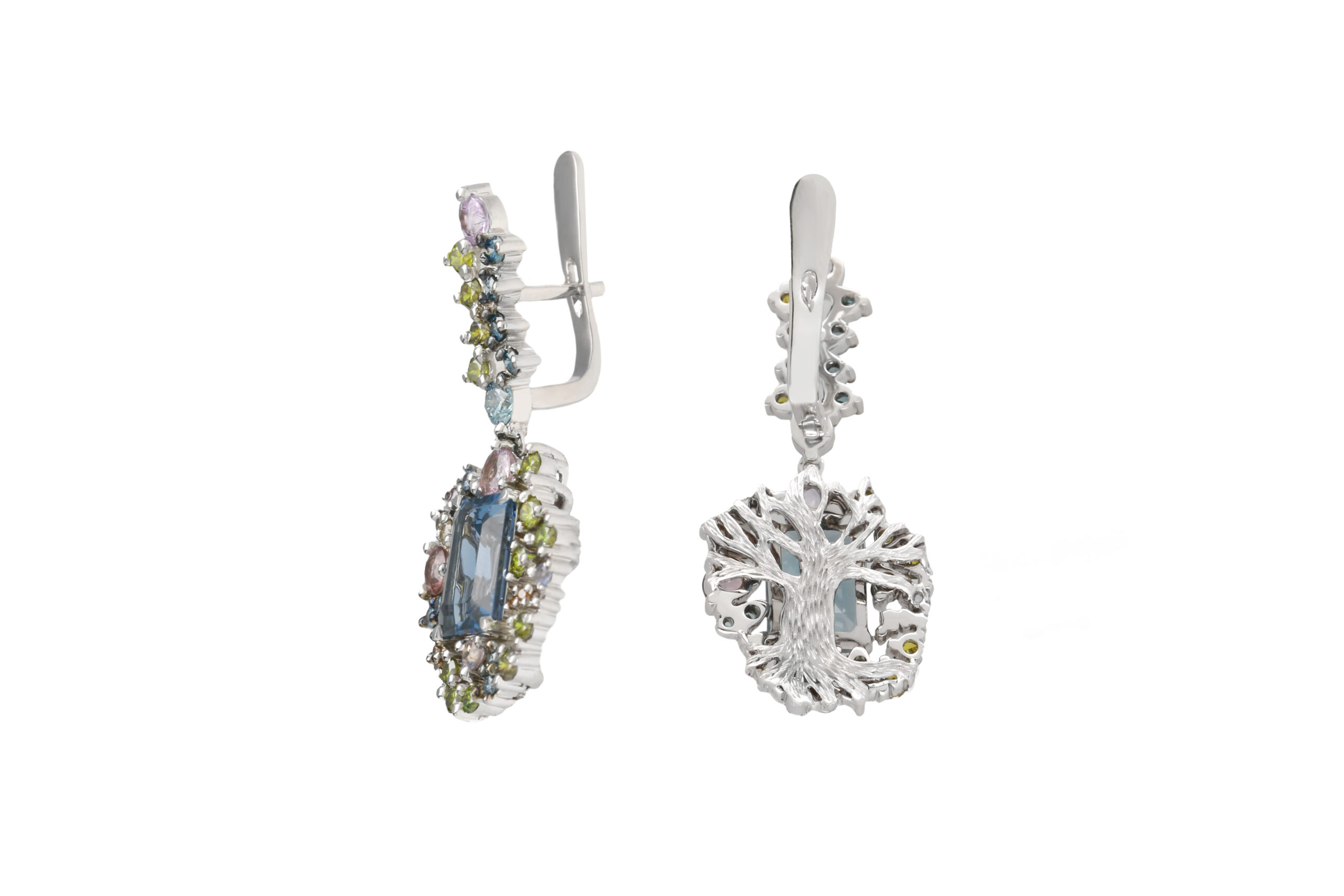 Earrings with diamonds, sapphires and topazes