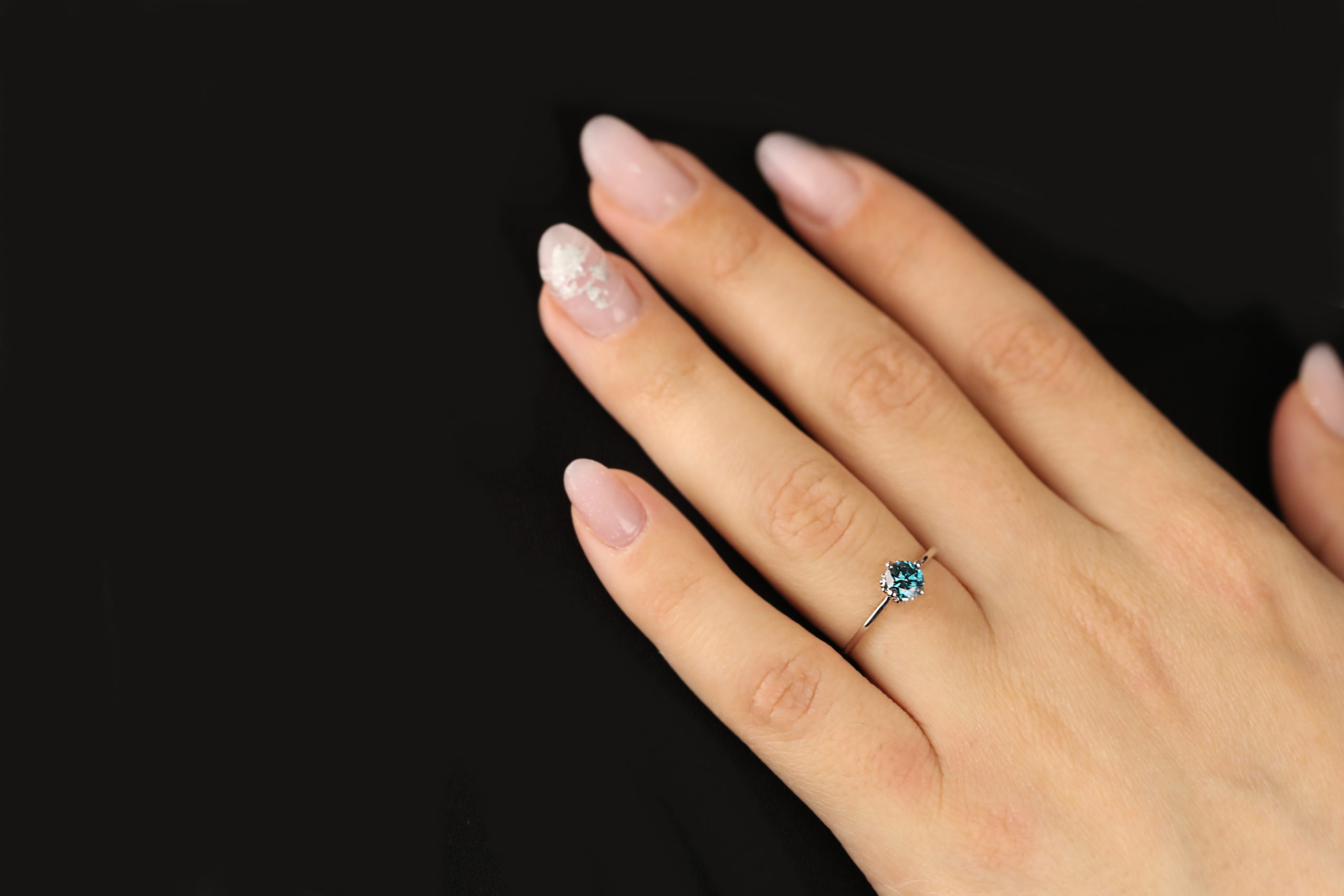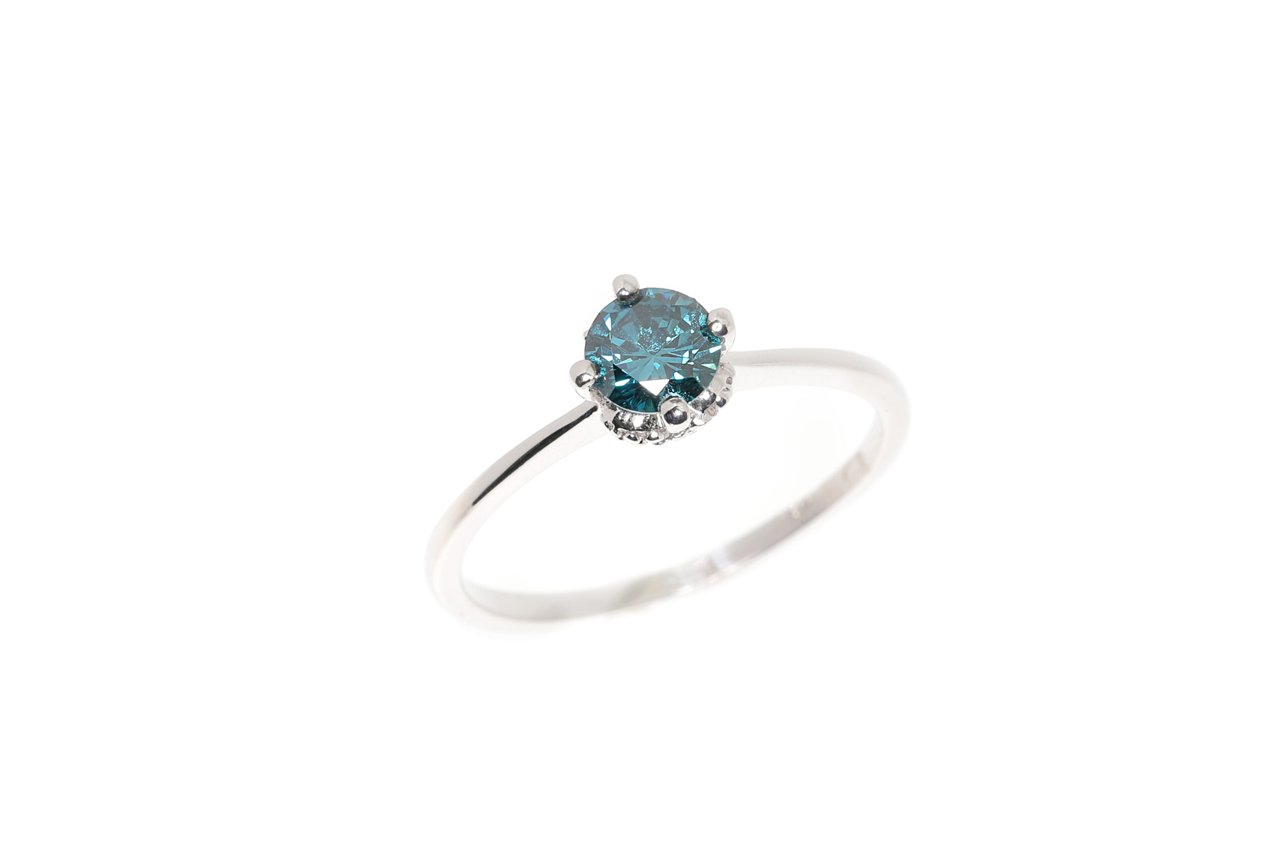 Descriere:Inel de logodnă din aur alb de 18 kt cu diamant azur de 0,455 ct.